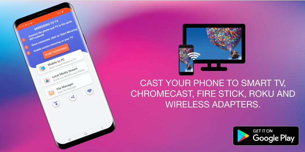 屏幕镜像助手应用程序支持从Android设备到电视的全屏共享,还支持Miracast无线显示适配器,例如Chromecast,FireTV,Roku和Anycast。