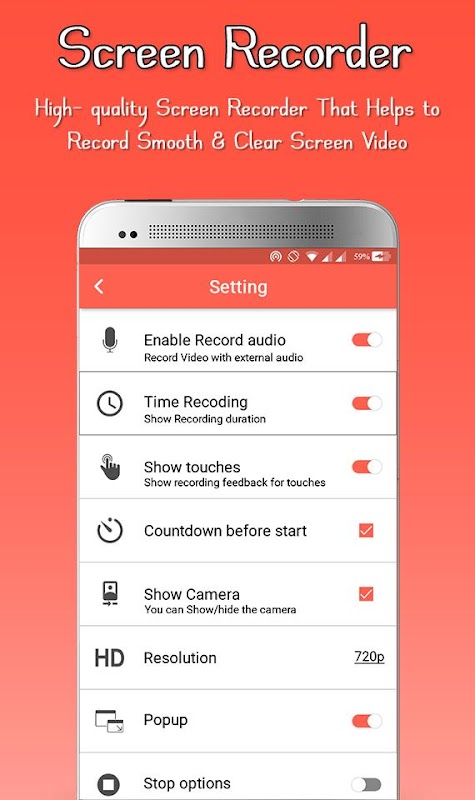 Screen Recorder is a free easy to use screen recording app to record and capture your mobile screen in video formats with or without front camera. With front camera enabled you can record video of mobile screen alongside your own video.
