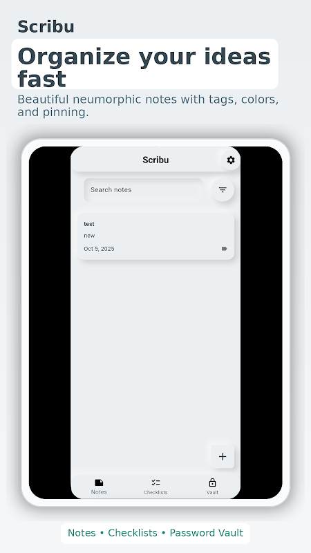 Scribu 是一款私密的离线笔记和密码保险库应用,专为注重隐私、简洁和安全的用户打造。记录灵感、管理清单并安全存储密码——无需网络连接、账户或数字签名。所有内容都保存在您的设备上,加密后完全由您掌控。
