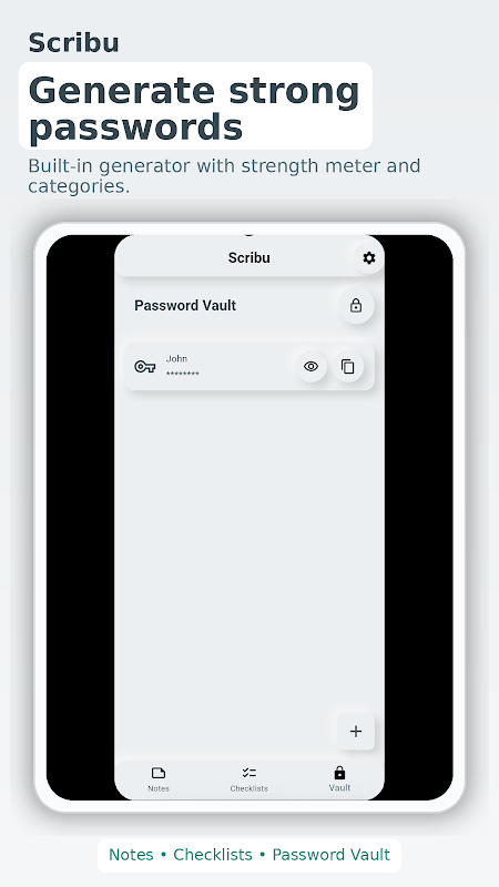 Scribu 的密码保险库采用强大的 AES 加密技术,保护您的凭证、网站和秘密笔记。您的主密码永远不会离开设备——只有其派生的哈希值存储在本地。