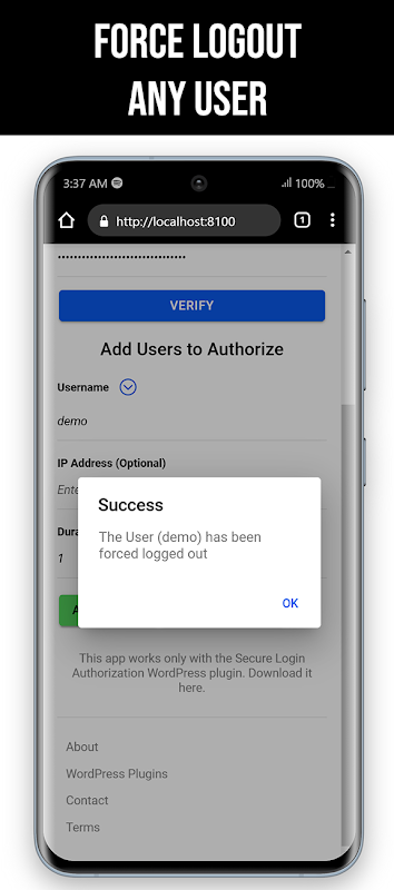 安装插件后,它会生成一个用户输入到应用程序中的密钥。该应用程序向特定用户授予在设定时间内的访问权限,并包括强制用户注销的功能。即使有人知道您的用户名或密码,这也可以防止未经授权的访问。