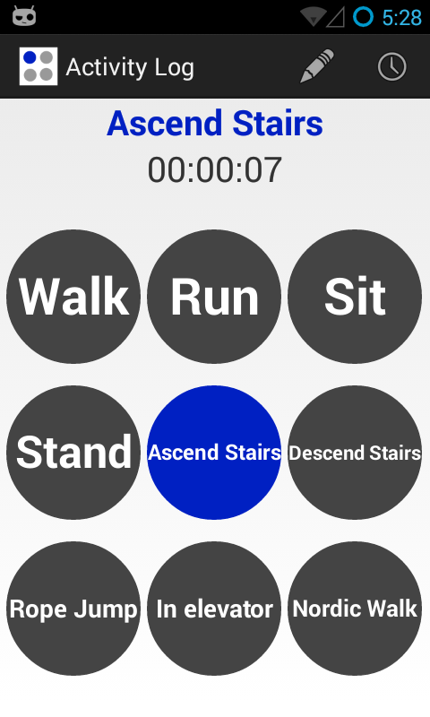 Log, label and export sensory data. This application is developed to ease the process of collecting and labeling sensory data from smart phones. Enter a label and choose associated sensors from available device sensors. Specified label appears as a round button on the application home screen and when the button is tapped, associated sensors begin recording data. Data are stored in the sqlite database and can be exported in CSV format. Collected data can be used to study various research questions in various fields such as activity recognition, indoor localization and context-aware computing.