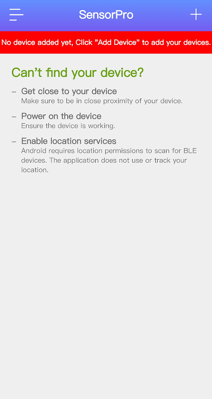 该应用程序允许用户将手机或平板电脑连接到设备,并显示当前测量值以及下载已保存的数据。为了通过BLE将Android手机或平板电脑连接到设备,Android要求打开位置服务并向应用提供访问位置数据的权限。这是一般的Android / BLE要求,无论是否使用位置数据,都允许扫描附近的设备。