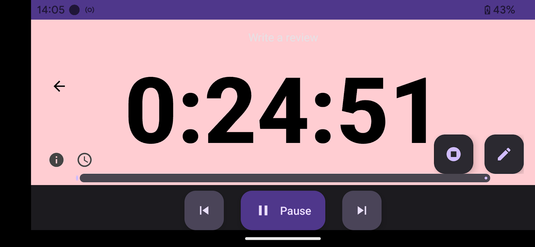 计时器运行时,通知会显示当前状态和剩余时间,您可以直接从通知控制计时器(暂停、恢复等)。