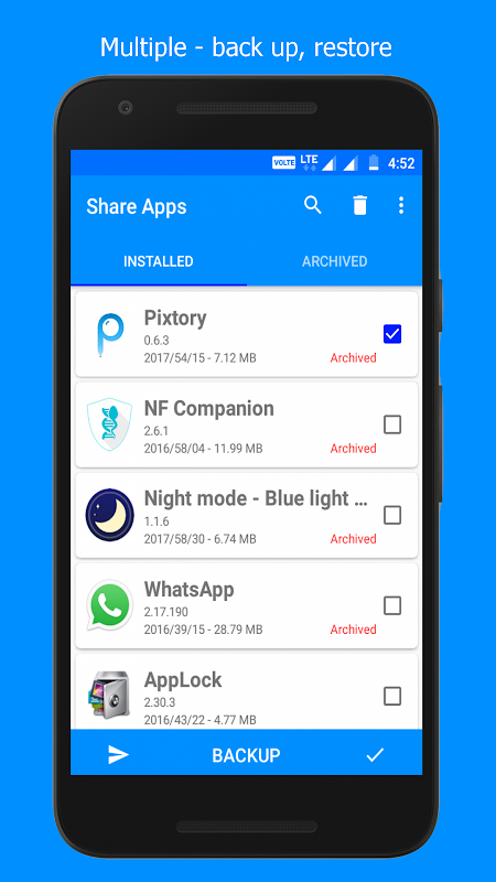 Share Apps & Backup also supports extracting apks from installed apps so that it can be backed up easily. You can also share multiple apks or archived files from your memory or directly share it by selecting multiple apps and tap on share button without extracting the apk files.