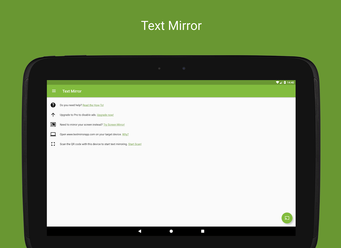 只要打开https://www.textmirrorapp.com您的远程设备上,你的Android设备上启动文本镜像过程中,扫描QR码和镜像将立即启动。就如此容易。需要您的目标设备上不需要额外的软件。