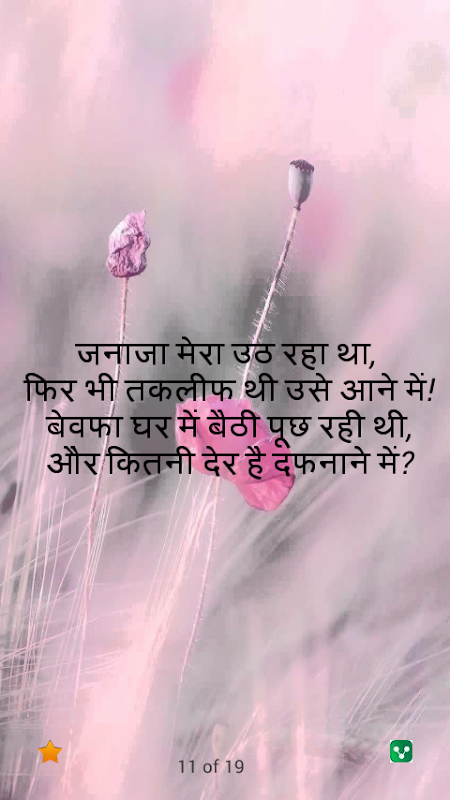 This app contains good collection of shayari in hindi language of different category like: Sad Shayari, life Shayari, mother Shayari, father, friendship Shayari,love Shayari, romantic shayri and many more in Hindi Shayari (Hindi) - शायरी