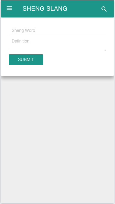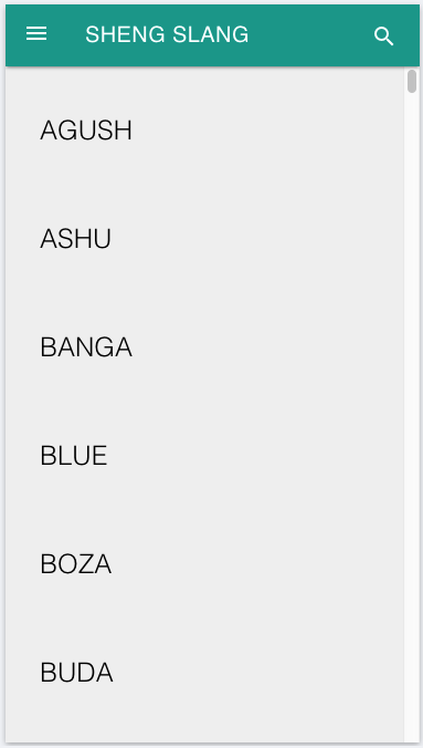 Sheng borrows from english and other languages of various ethnic groups in East Africa.The sheng words are defined in english accompanied by an Use example for each word in sheng.The application allows users to contribute to the dictionary by submitting new words.