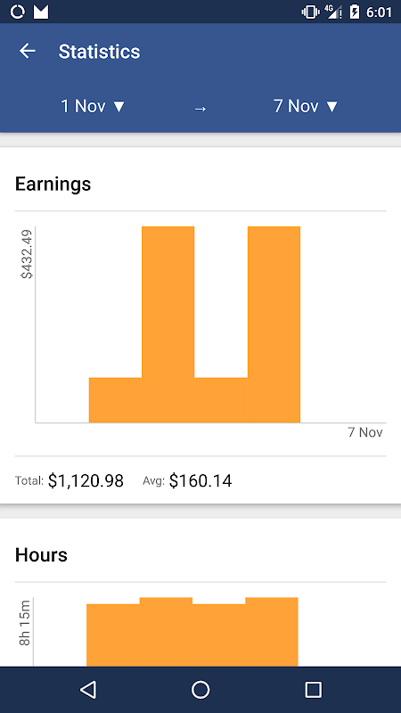 ✔ View detailed statistics about your earnings and hours worked for any time range
