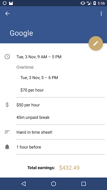 There is also a premium version of this application available at https://play.google.com/store/apps/details?id=com.dgsd.android.ShiftTracker