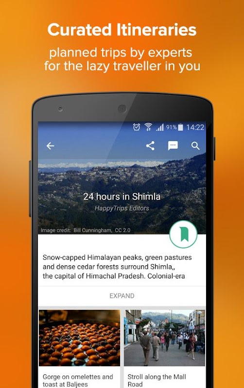 • PLAN USING BOOKMARKS & ITINERARIES: Plan using bookmarks in Shimla Travel Guide app. Select your favourite hotels, cafes, restaurants, places to visit & sightseeing options in Shimla travel guide & access content offline when in Shimla. Or simply follow curated Shimla Itineraries present in 24 & 48 hour formats.
