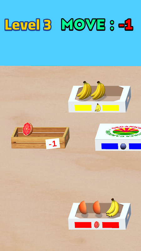 为此,将相同类型的水果匹配到指定的白色运输箱中。使用唯一的木箱移动和交换水果以对齐。