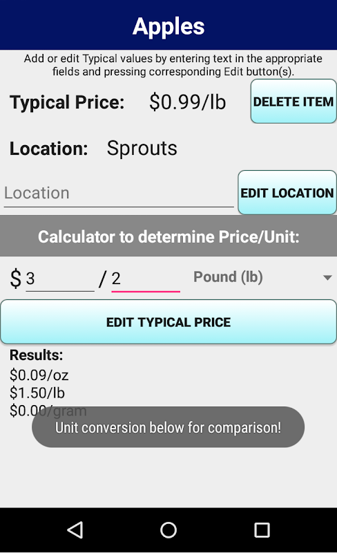 As part of the personalized price database, the user can run the comparison calculator that allows user to compare prices in various units so you don't have to do the math. User simply enters the price and quantity unit seen on the label and the calculator outputs price per unit.