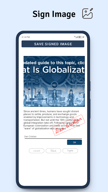 Signature Maker - Docs & Photo 提供了一个全面的解决方案,用于在各种文档类型中创建和应用自定义签名和印章。轻松签署 PDF、图像甚至扫描文档,同时享受水印、实时预览和文档管理等功能。该应用程序支持多种文件格式和无缝集成,可确保高效、专业的签名和文档处理。