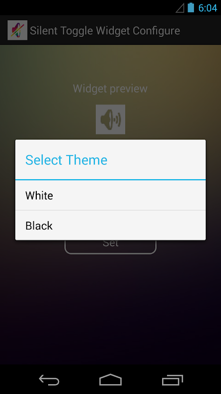 -when enabling or disabling. - Quickly switch between modes, no need to open a separate app RE ADD WIDGET AFTER UPDATE!!! How to Used: Android 2.2,2.3: Long press on the home screen -> Add Widget -> Silent Toggle Widget. Android 4.0 or higher: Home screen-> menu-> widget tab-> Silent Toggle Widget