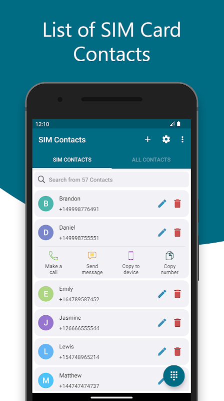 该应用包含 SIM 卡联系人列表,并允许您执行呼叫、短信、编辑、删除、复制到设备等操作。