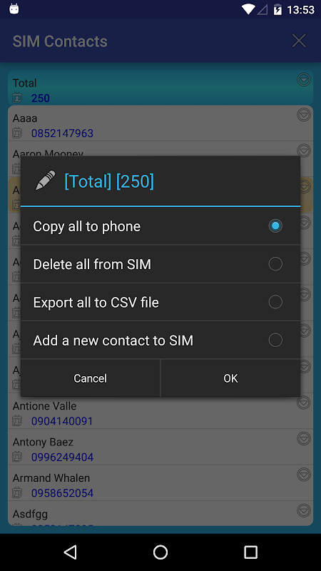 * Copy all contacts from sim card to phone device.