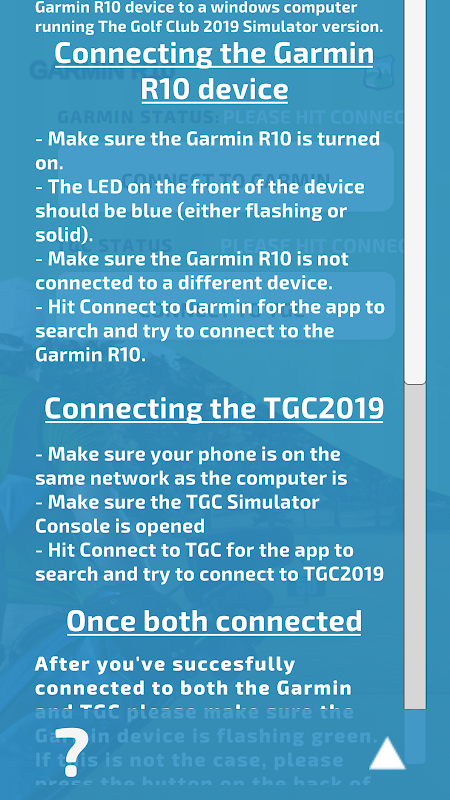通过此应用程序,您可以将 Garmin R10 Approach 连接到 The Golf Club Simulator 2019 软件。这将允许您与多达 4 人一起打高尔夫球,无论是本地的还是在线的。参加令人惊叹的 4k 现实生活和奇幻课程的在线锦标赛。