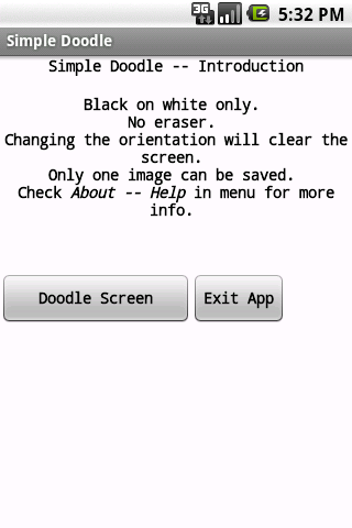 "Simple Doodle" provides a basic drawing pad for doodling. Pad is black ink on a white background without an eraser. Select the 'Doodle Screen' button from the introduction screen or the menu to bring up the doodle screen.