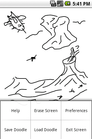 A doodle screen may be saved for later reload. Only one screen is saved (save will overwrite any previously saved screen). Orientation can be locked by a preference setting. Touch to draw point offset is also set as a preference.
