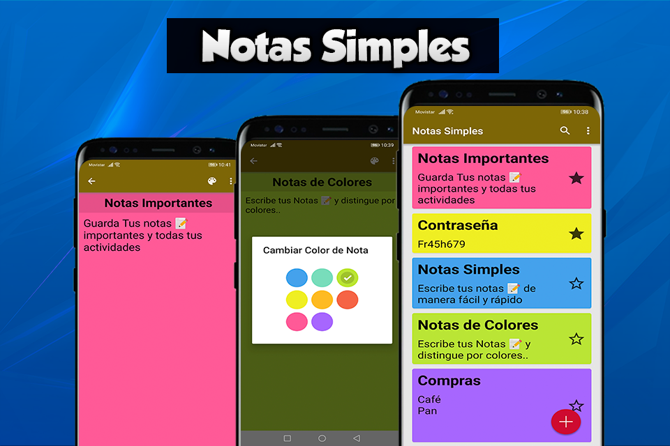 Simple Notepad App It has for you an application that shows you all its contents in an easy and fast way, save all your work and activities and add to each note a color and distinguish them by colors easily capture everything that goes through your mind as well as any data important that you want to save, Your best option to save your Simple Notepad App