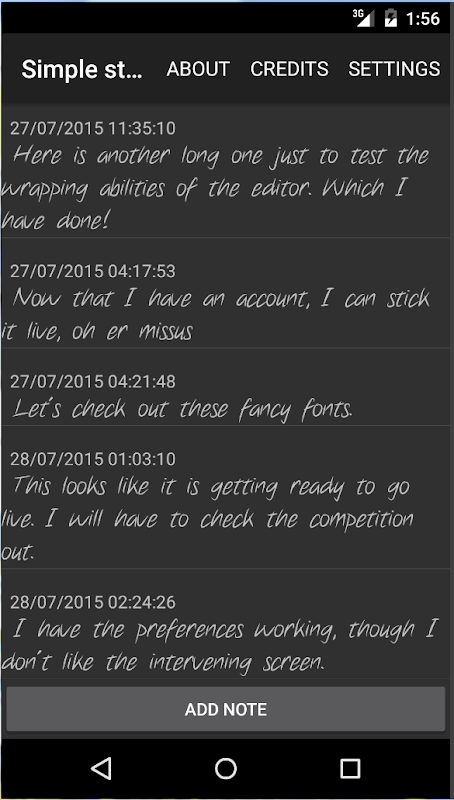 这是一个极其简单的应用程序。写下便条,它会保存它以及制作的日期和时间。差不多就是这样了。您可以编辑内容,但不能编辑日期,或者删除注释。没有警报或提醒或无论如何将其与任何其他应用程序同步。