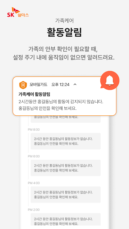3. 가족케어 - 활동알림: ‘혼자 계시는 우리 어머니, 잘 계시겠지?’ 안부는 모바일가드가 대신 확인해 드릴게요. 설정된 주기 안에 스마트폰의 움직임이 없으면 보호자에게 알림을 드려요.