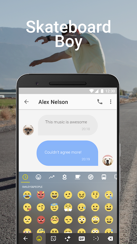 This Skateboard Boy Keyboard Theme uses Facemoji Keyboard Facemoji Keyboard + GIFS. Please click the link to have it installed first.
