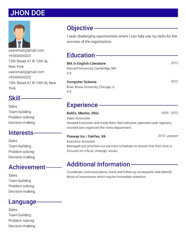 4. 带照片的简历 - 免费简历创建者可以选择照片。所有印度模板,提供添加个人资料照片的选项。