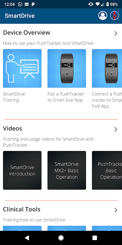 Smart Evaluation app provides users with the capability to update the firmware on their SmartDrive and PushTracker. As well as various training and educational material. The following outlines some of the features for different users.