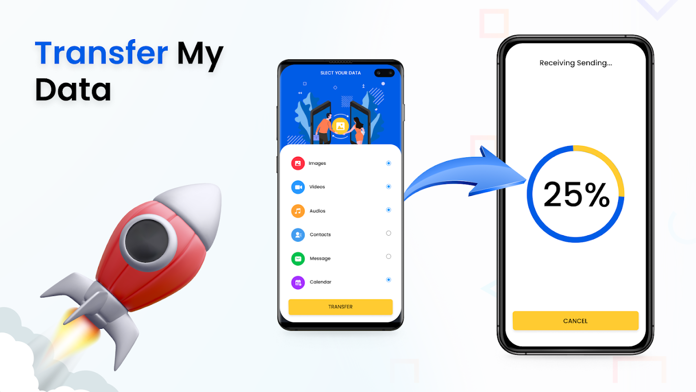 复制我的数据内容传输可快速将文件从一台设备移动到另一台设备。借助此“复制我的数据”应用程序,用户可以轻松与朋友和家人共享文件和文件夹。智能开关复制我的数据包括各种类型的信息,例如联系人、 照片、视频和音乐文件。此内容传输共享从 安卓 到 安卓 的所有类型的文件和文档。