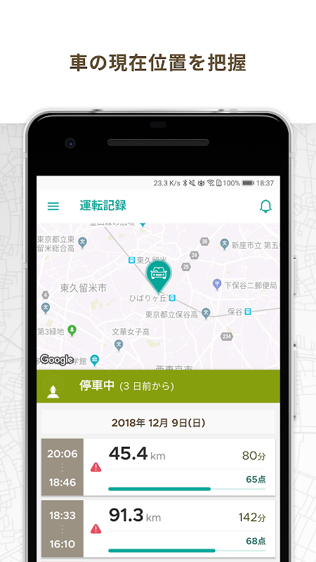 アプリの地図で、現在どこに車があるのかがわかります。また、車が走行中のときは、リアルタイムに地図上を車のアイコンが動くので、最新の現在地を常に追うことができます。