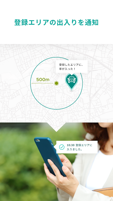 ご家族がよく行くエリア(自宅、病院、スーパーなど)を登録すると、そのエリアへの車の出入りをリアルタイム通知でお知らせします。