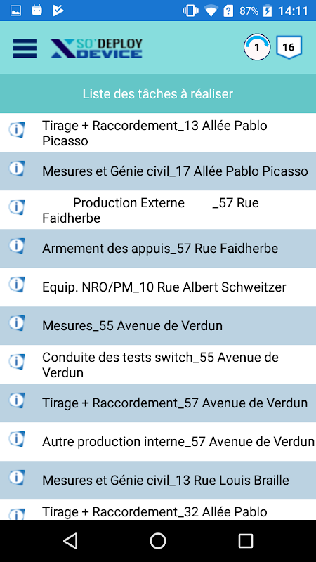 Solution mobile IXIFIBER pour les techniciens travaux Sogetrel. L'objectif avoir la liste des Tâches de production travaux à réaliser sur le terrain et pouvoir remonter dans IXITRAVAUX et IXIETUDES IXIFIBER, la réalisation des travaux avec les photos et informations nécessaires.