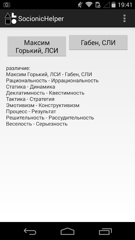 Выбираешь одного и второго. Программа пишет, чем отличаются, т.е. признаки Рейнина, которые разные у этих типов, общее тоже можно посмотреть и список признаков у одного типа. Для большего удобства добавлен список отношений.