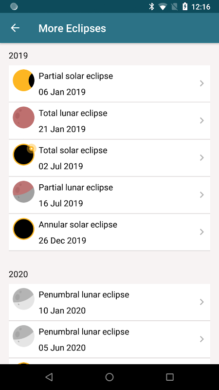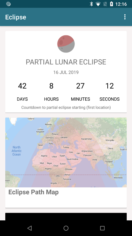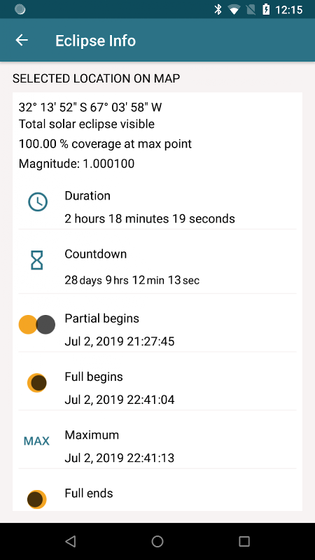 This astronomy app calculates upcoming and past eclipses of the Sun and Moon, anywhere in the world. Easily find local times for when a total solar eclipse is visible or use the map to see where you have to go to see the next total lunar eclipse.