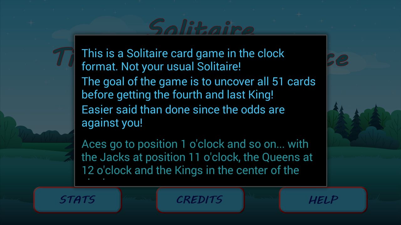 The goal of the game is very simple; to win you must uncover the fourth King at the very end of the game when all other cards have been put in the correct clock positions. You start the game by drawing a card from the center pile of the clock (position 13) and move that card to the top of its corresponding "rank" pile. When you place a card in the correct position, the card under that pile will be uncovered automatically by the system. You keep going until you uncover the fourth and last King. When you uncover the last King, the game is over since there is no more card to draw from position 13 of the clock. At this point, you win only if all cards have been uncovered and placed at their correct positions. A card counter at the bottom of the screen will indicate how many uncovered cards are remaining.