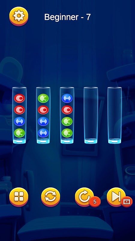 • 规则是,只有当两个球具有相同的颜色并且要移入的管子有足够的空间时,您才能将一个球移动到另一个球的顶部。