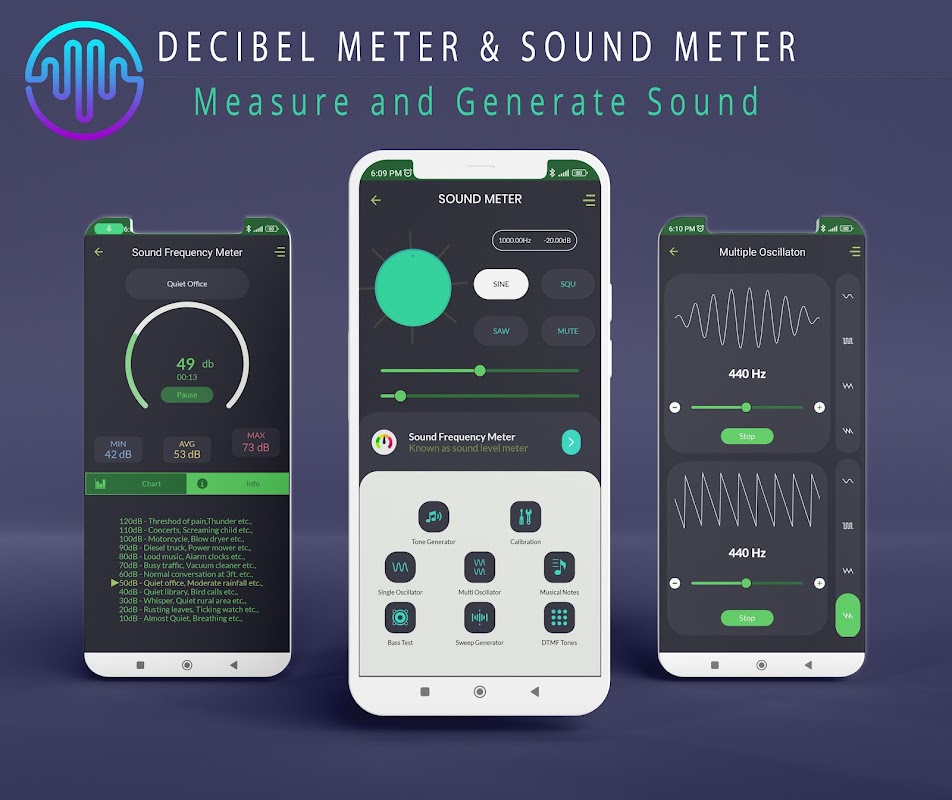 分贝计和频率发生器是声级测量的宝贵工具,可保护您的听力健康并防止高分贝水平造成的损害。此外,它还具有波形声音发生器和振荡器,适合音频专业人士和爱好者。声音计功能有助于确定环境噪音水平,显示当前噪音参考值以及最小/平均/最大分贝值。轻松重置声级并管理噪声样本收集。