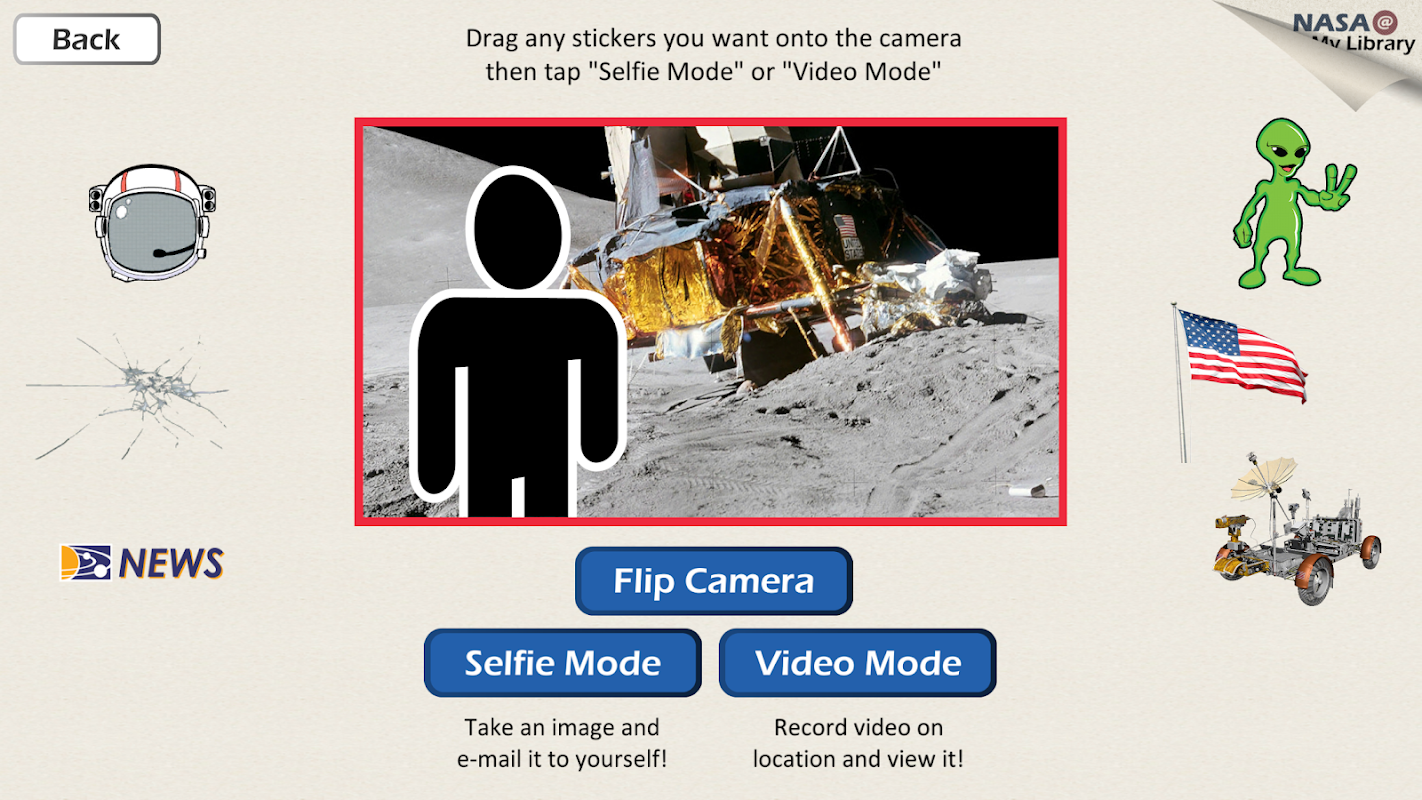 使用这款绿色背景的应用程序,在月球、火星等地拍摄照片或视频。此应用程序最初设计用于图书馆程序。有关想法和提示,请访问 http://clearinghouse.starnetlibraries.org 并搜索 Space Stage。