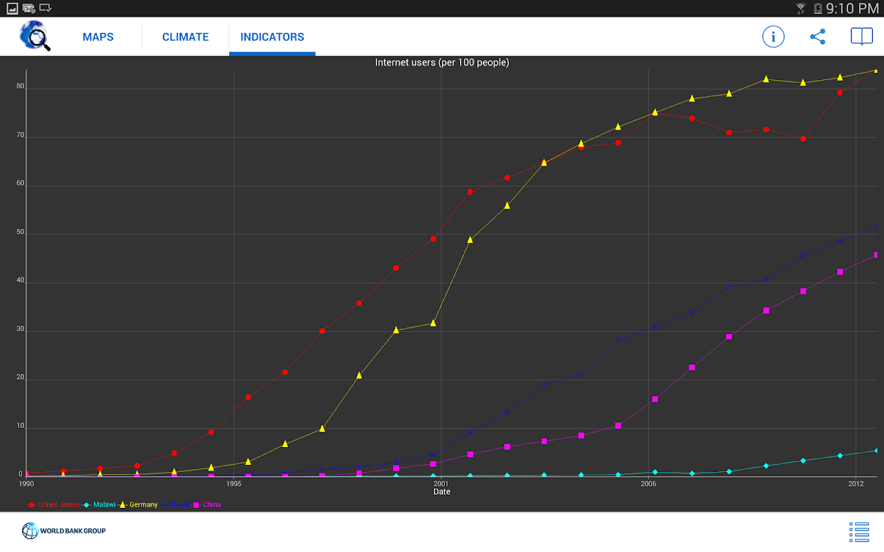 This innovative App has been developed by the World Bank to improve awareness of the growing collection of global public-domain datasets useful for those interested in development issues. It helps access and visualize multi-sectoral spatial and temporal data from a range of institutions by drawing upon their map and data services. An amazing array of information puts the world in your hands!