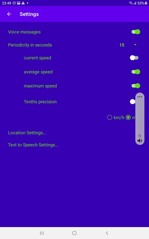 在设置中,您可以选择播报的速度类型——当前速度、平均速度或最大速度——并调整提示之间的时间间隔。通知间隔范围为15至900秒,使该应用程序既适用于短途跑步,也适用于长途骑行。您还可以启用每公里配速提醒,这对于跑步或骑行速度测量非常实用。该应用可作为带有语音提示的 GPS 速度计使用,让您无需查看手机即可舒适安全地进行训练。