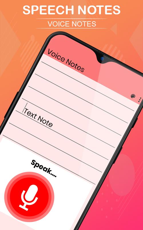 Voice Notes Converter You can select a color scheme to suit your tastes in the settings. The app comes with a large number to select from. There is even a black-and-white theme for those who prefer a high-contrast interface. Speech Notes App Can export all of your notes to a machine-readable format or as plain text. Voice Notes Changer is all languages Voice Typing app, Speech Notes can be used as Voice notes using this you won't need any keyboard. You will just type with your voice. Hence it works as voice dictator. This amazing Speech Notes App can be used to save the voice typed text as Voice notes. These notes can be edited later.