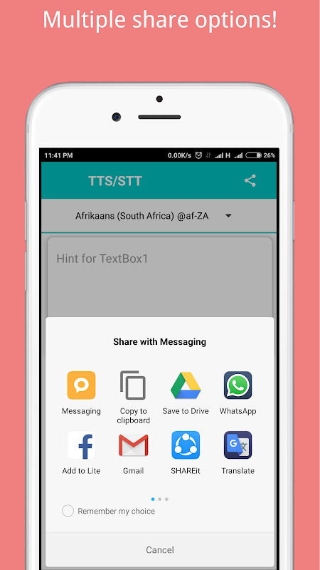 Get off from boaring typing.Our app make easy to type faster on mobile only by talking.It has also feature of text to speech.If you want to type something then talk to phone it will type for you.If you want to read something type or paste in app it read for you loudly.