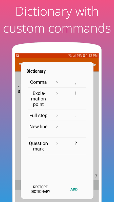 - 字典(您可以添加自己的标点符号命令),例如。 “?”的“问号”,(ENTER键)的“新行”