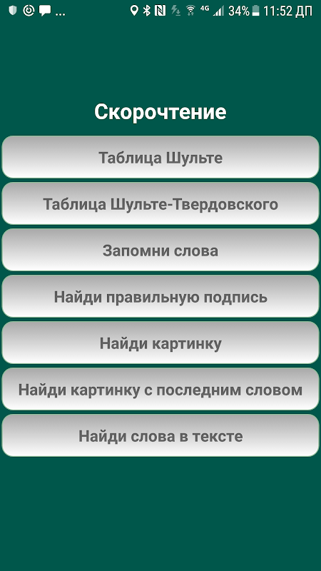 2. "Таблица Шульте-Твердовского" - таблица случайно расположенных слов. В центре таблицы картинка. Нужно как можно быстрее нажать на слово соответствующее картинке.