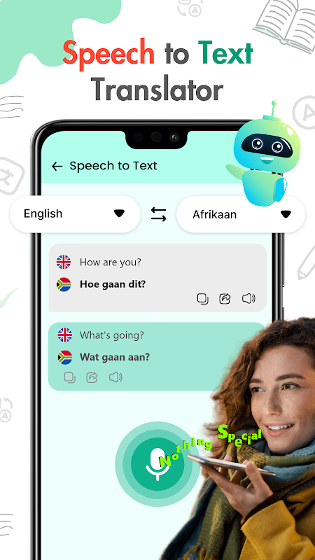 语音翻译器或语音翻译可帮助您用母语说话并将其翻译成任何语言。按下麦克风并说出您想说的任何内容,并获得文本形式的翻译。