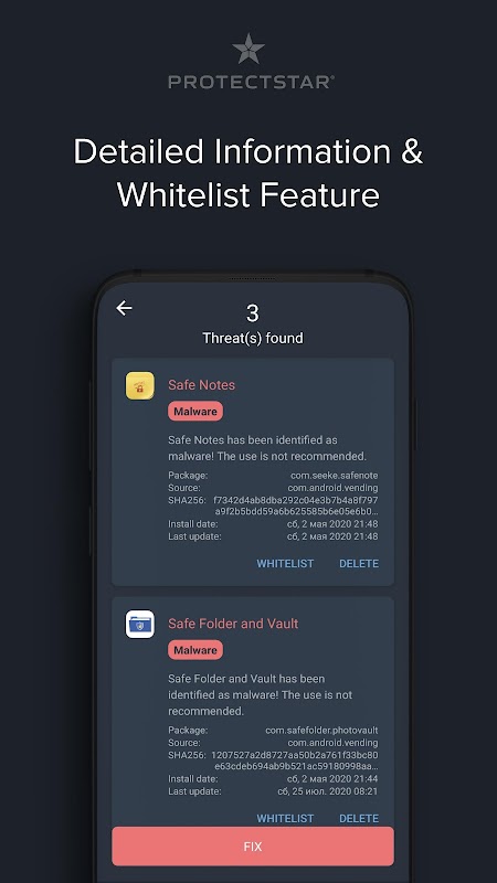 + 检测欺诈元素,如 HiddenAds、FakeApps、Sms-Thief、Exploits、BankBots、Anubis、AgentSmith、Joker、Ransomware 等。