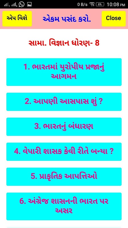 Pankajsid34推出古吉拉特语测验android应用程序,用于社会科学主题的第6、7、8个第一学期(旧课程)。该应用程序的星级功能如下。
