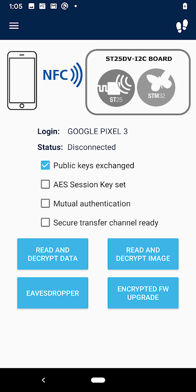 ST25DV-I2C CryptoDemo应用程序显示了如何在STM32微控制器和Android智能手机之间通过NFC建立安全的传输通道。它使用ST25DV-I2C NFC标签的快速传输模式(FTM)功能。